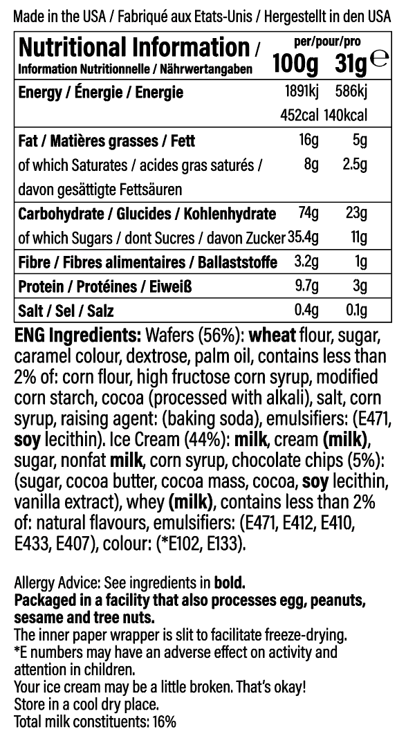 We take the ice cream you know and love, and with the power of freeze-drying create a yummy new snack. Frozen in time, yet not frozen in temperature. When you remove the water from ice cream, what do you have? A delicious, crunchy, creamy sweetness that melts in your mouth, sandwiched between two chocolatey wafer cookies.